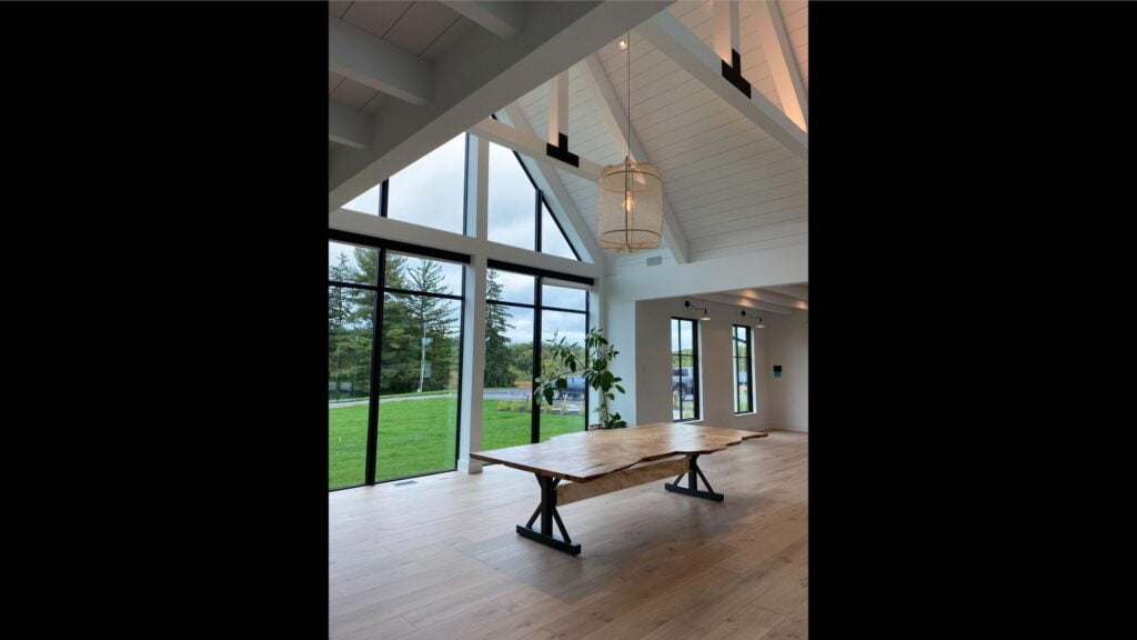 Many Architects talk of “connections” to their surroundings but often don’t fully deliver. Modern Farmhouse truly “walks-the-walk” with expansive glass planes – particularly in the great room – creating an axial transparency that allows the outside to visually pass-through the plan. To this end, the exterior wall of the yoga room is also a delight.