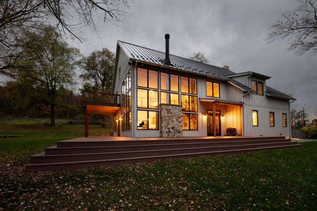 This project was conceived as a pastoral retreat from the clients’ New York City loft. It warranted a deep connection with nature, rich materials, and a breathable space. Elements of wood, stone, and metal create a tactile, warm atmosphere in the midst of high ceilings and unbounded views. This open two story volume is a modern expression of the barns of Bucks County with an open floor and a souring, vaulted ceiling. The “barn” is evident in the overall shell of the house but is challenged by the lack of traditional wood timber framing, which was replaced with long spans of steel. The result is a space that breathes: The comfort of the farmhouse with all the light, views, and openess it rarely receives. The new residence sits on the existing foundation and retains elements of the existing house. While many improvements were made, the original entry remains as a memento of the existing home. In adapting this new design, the building grew in height to take advantage of the tremendous views and to accept the moving sun at all points of the day. The house, which sits at the crest of hilltop, is then set on a terraced deck, elevating it above the landscape. The thoughtful joining of spaces creates a functional, livable floorplan where rooms are deliniated by changes in height or gestures of exposed structure. The staircase, in keeping with the home, embraces the “modern farmhouse” feel with elements of steel and wood.